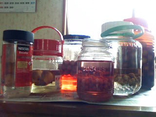 分かりにくいですが、左から杏酒(ジンベース)→枇杷酒→苺酒→ぐみ(と父がいう謎の実)酒→梅酒→黒糖梅酒、となってます。